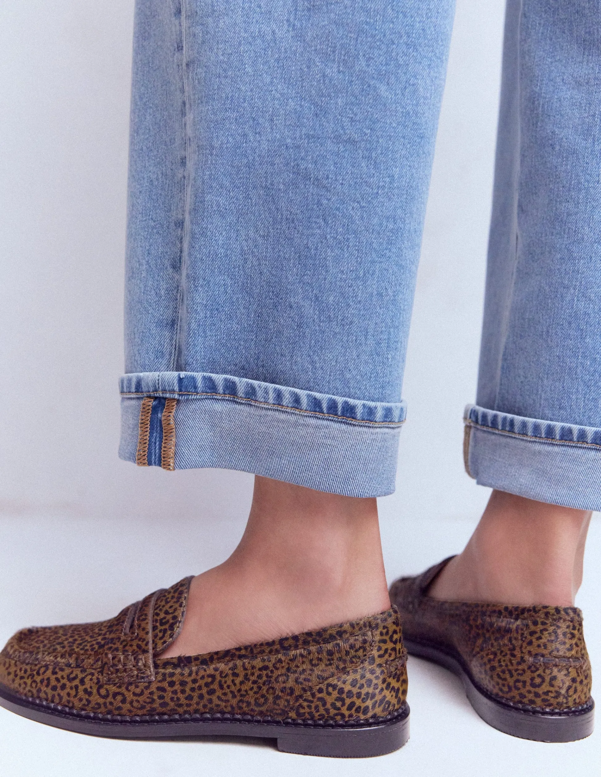 – Dessus poils sur peau de vache, Chaussette et doublure cuir, Semelle fabriqué par l’homme