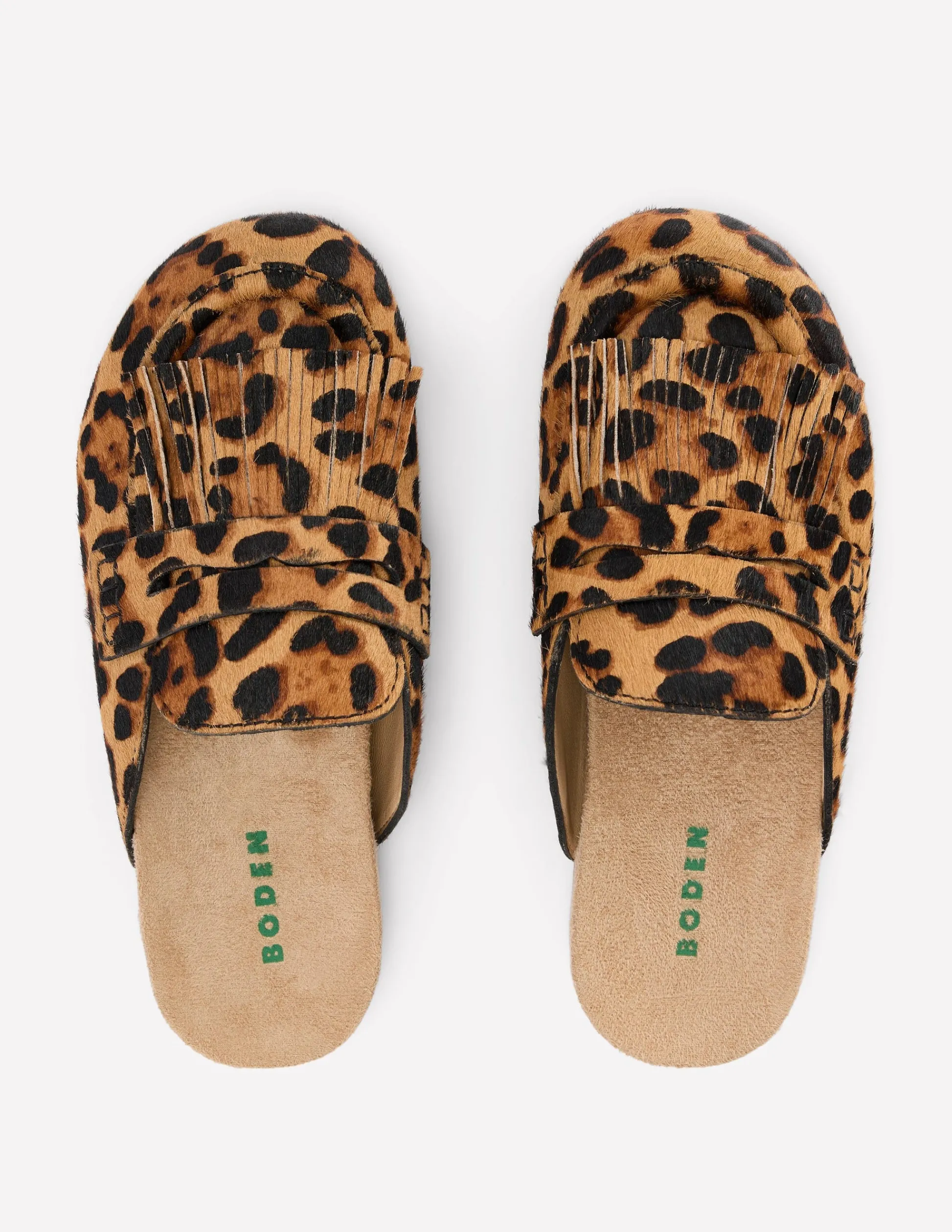 Boden Chaussures Plates-Sabots Etta façon mules avec franges Klassisches Leopardenmuster Ponyhaar
